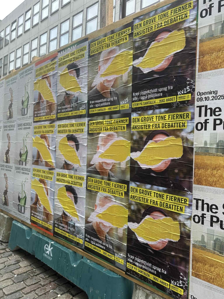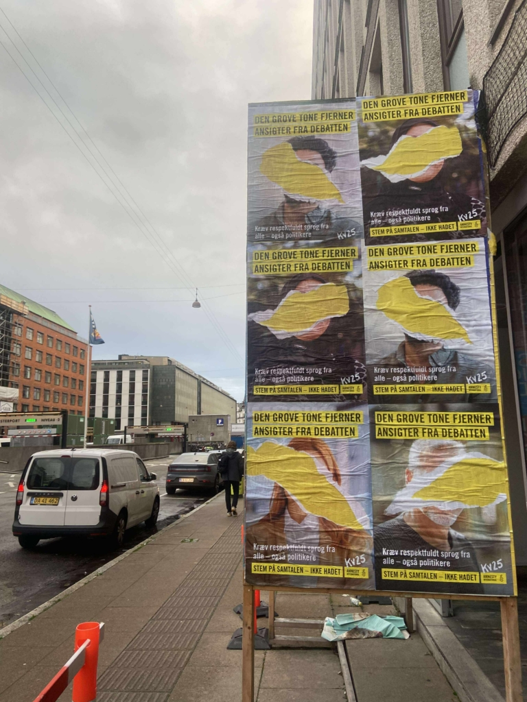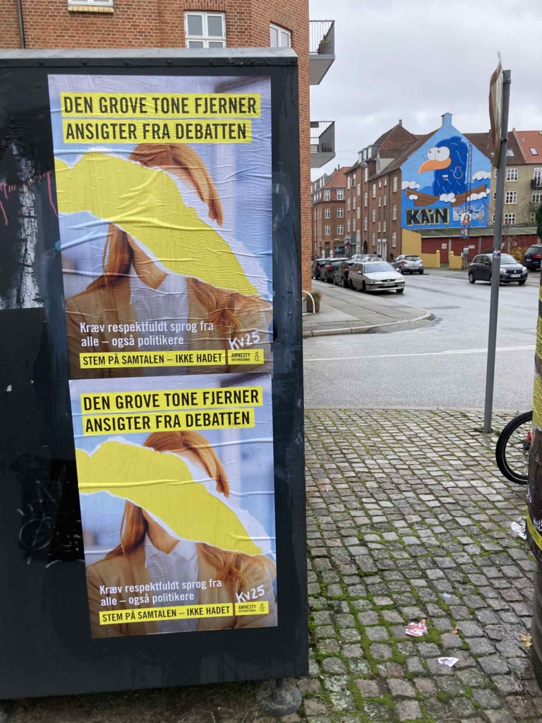 Inspireret af de klassiske valgplakater har Amnesty under kommunal- og regionsrådsvalgkampen hængt plakater op landet over med et budskab om, at folk trækker sig fra debatten, når tonen går i retning af had. Foto: Amnesty International Danmark
