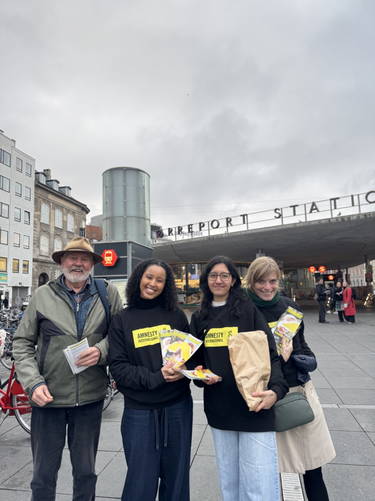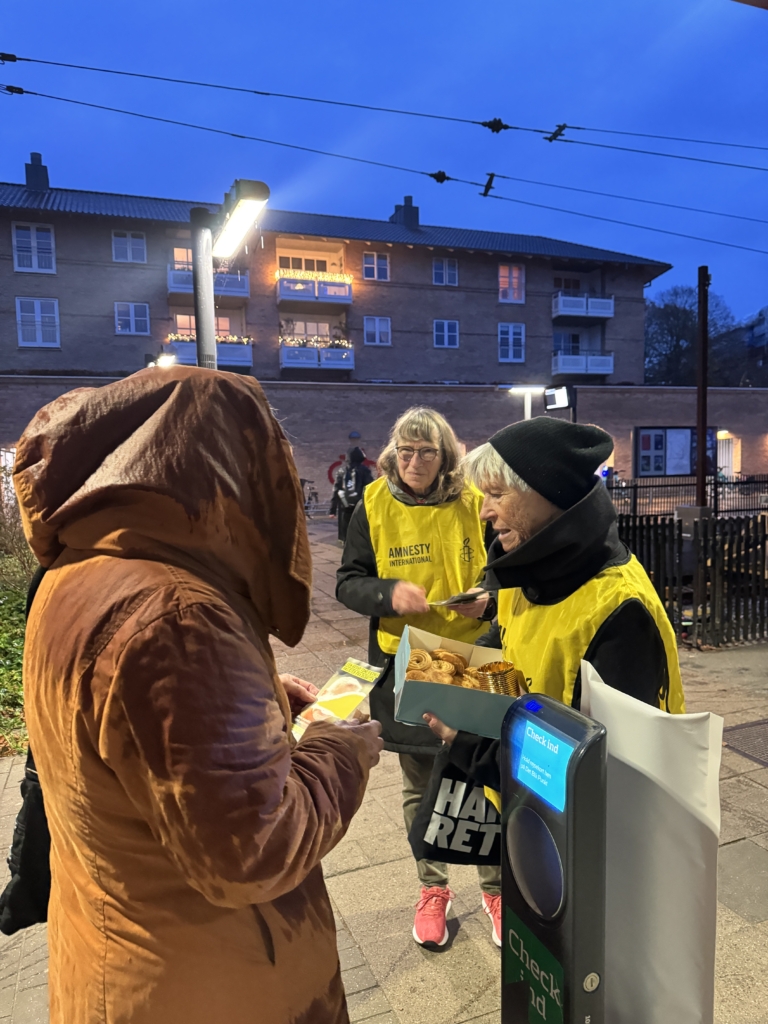 I kommunal- og regionsrådsvalgkampens slutspurt har frivillige delt flyers ud og talt med vælgere på togstationer rundt om i landet. Her er det henholdsvis i Vejle, i Farum og på Nørreport Station i København. Foto: Amnesty International Danmark